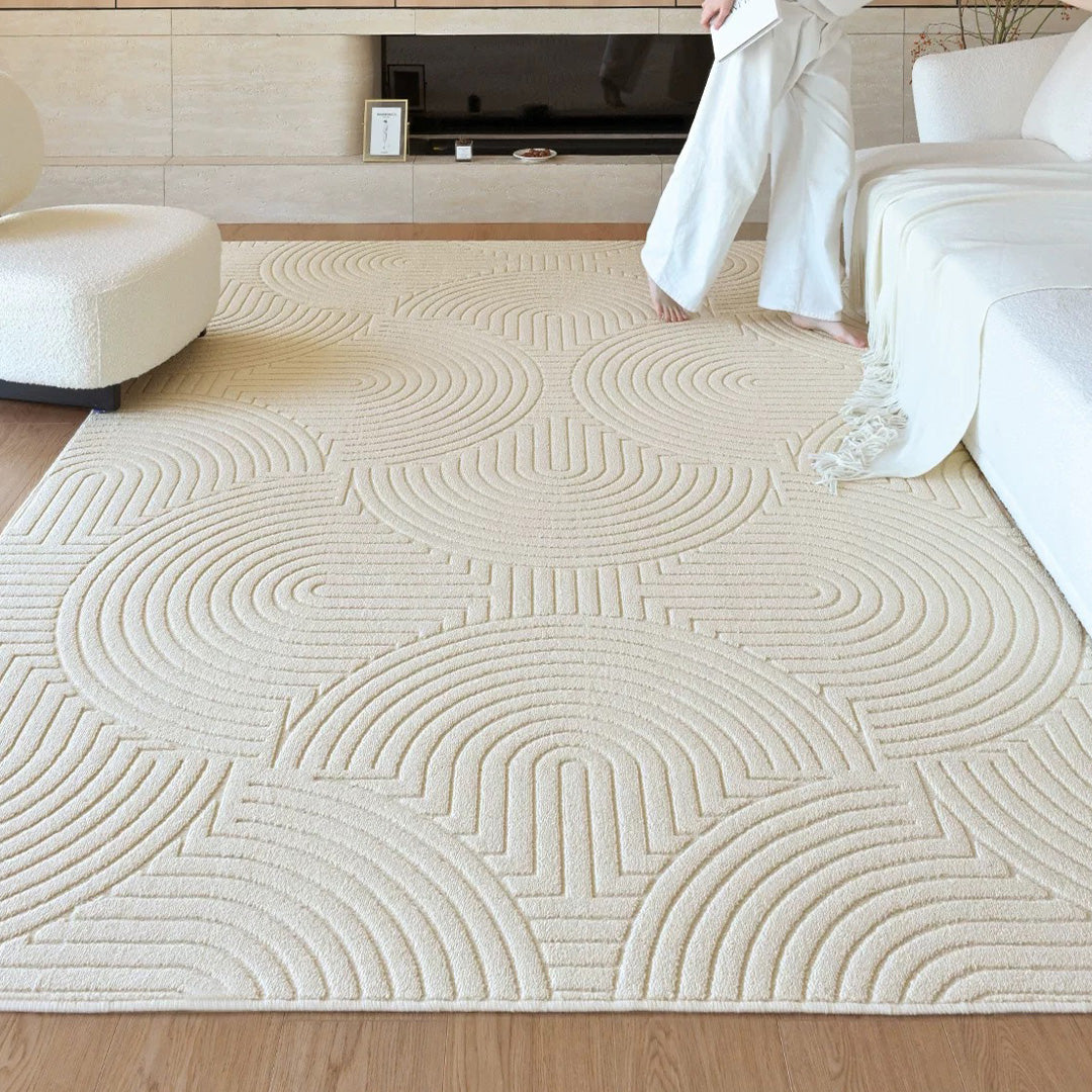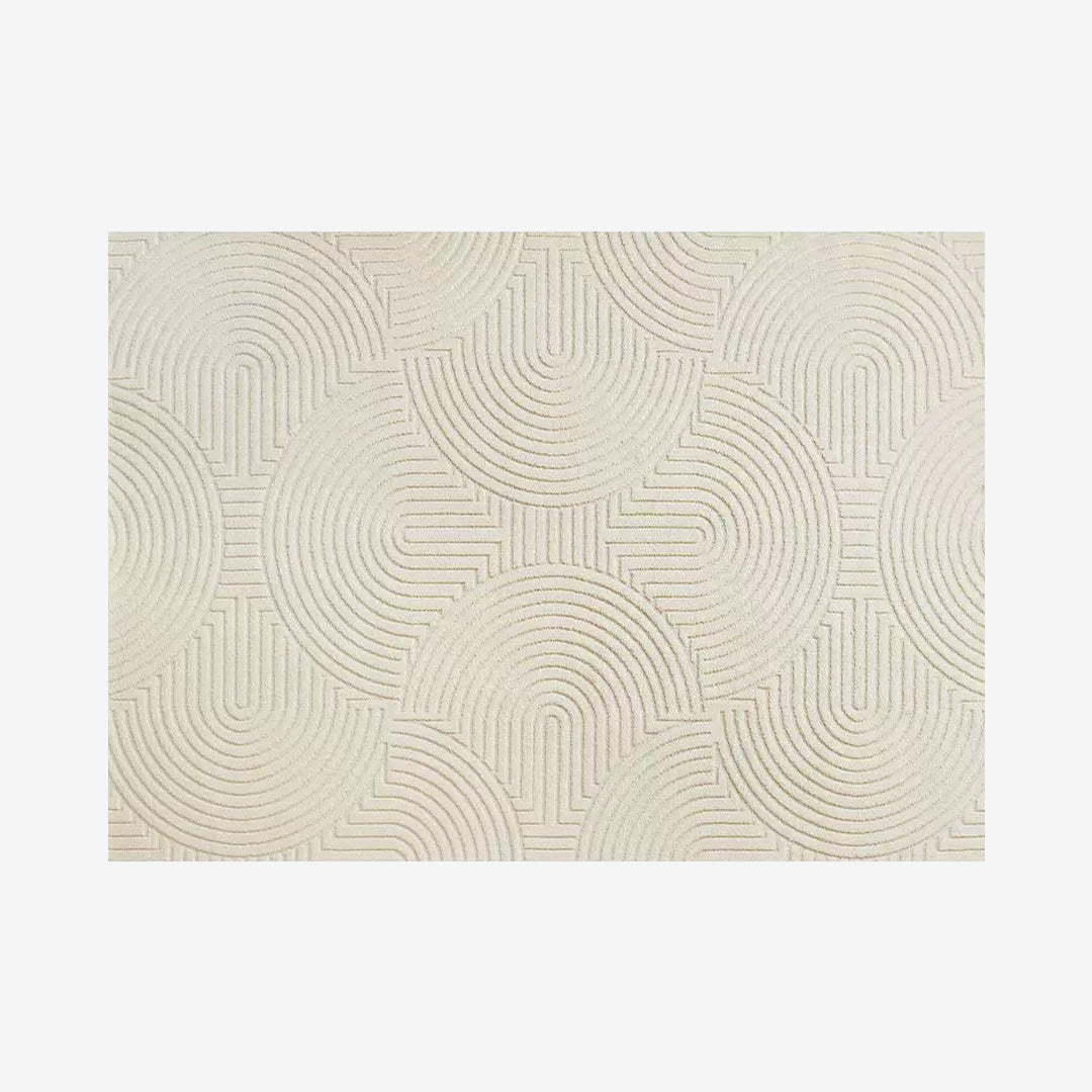This rug features a curved geometric pattern enriched with a delicate embossed texture. The surface feels smooth and refined, with a gentle, jade-like warmth that softens the structured geometry. The design creates a balanced sense of depth and elegance, making it a refined choice for contemporary and minimalist interiors.