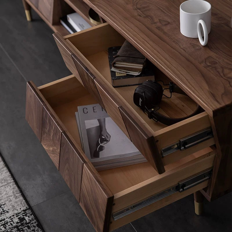 Crafted from solid North American black walnut, this TV stand showcases the wood’s rich natural grain and timeless warmth. Its clean, modern silhouette brings understated elegance to any living room, while the durable solid-wood construction ensures long-lasting stability.